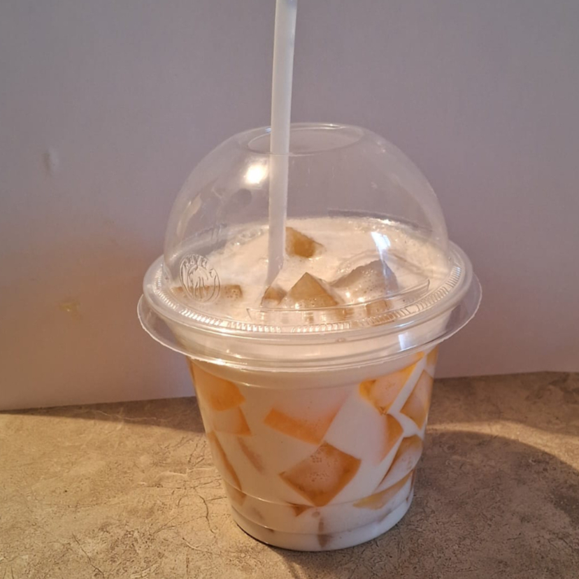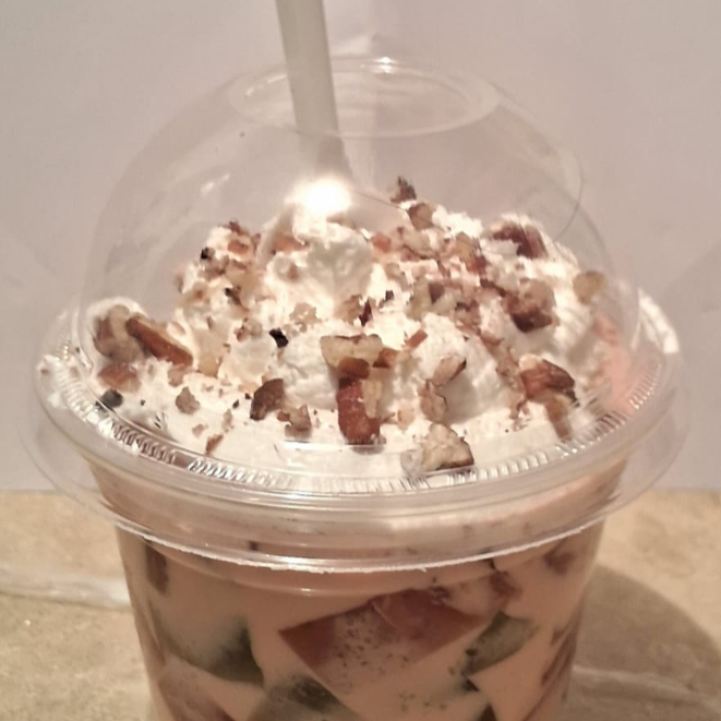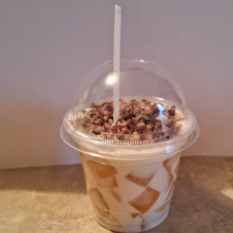 Gelatina de piña servida con una preparación cremosa con cubierta de chantilly y espolvoreada con nuez
