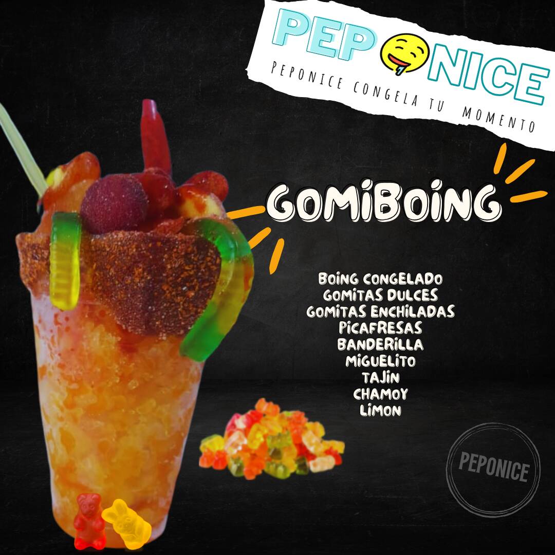 Disfruta de nuestra refrescante y divertida creación, el GOMIBOING. Boing congelado de mango o fresa de 250ml preparado con una variedad de jugosas gomitas, polvos miguelito y tajín, con chamoy y limón que añaden un toque de diversión y textura. Esta combinación crea una explosión de sabores dulces, ácidos y picantes que te sorprenderá. Perfecto para refrescarte y disfrutar de un momento único