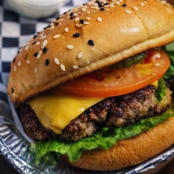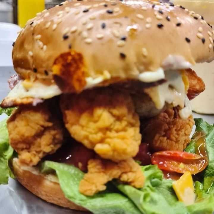 pan brioche jugosa carne sirlon, tocino, cebolla caramelizada y queso acompañada de los aderezos de la casa.