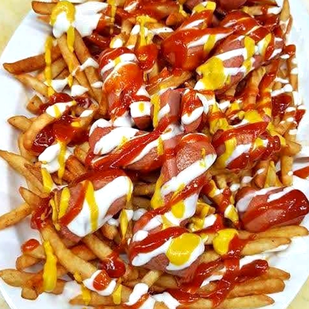 Crujientes papas acompañadas de salchichas fritas con catsup y salsa Valentina