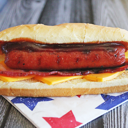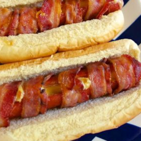 Pan, base mayonesa y orégano, salchicha de pavo, envuelta en tocino, acompañado de jitomate, cebolla, jalapeños.