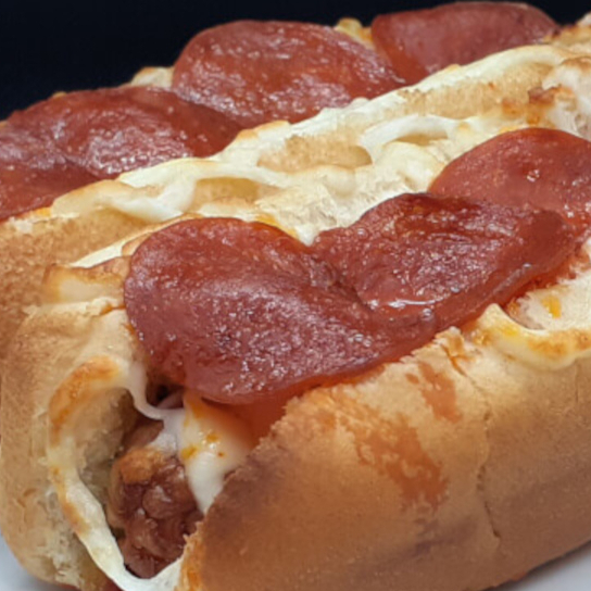Pan, base mayonesa, salchicha de pavo, encima salsa de tomate, mozarela, pepperoni crujiente.