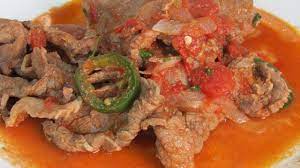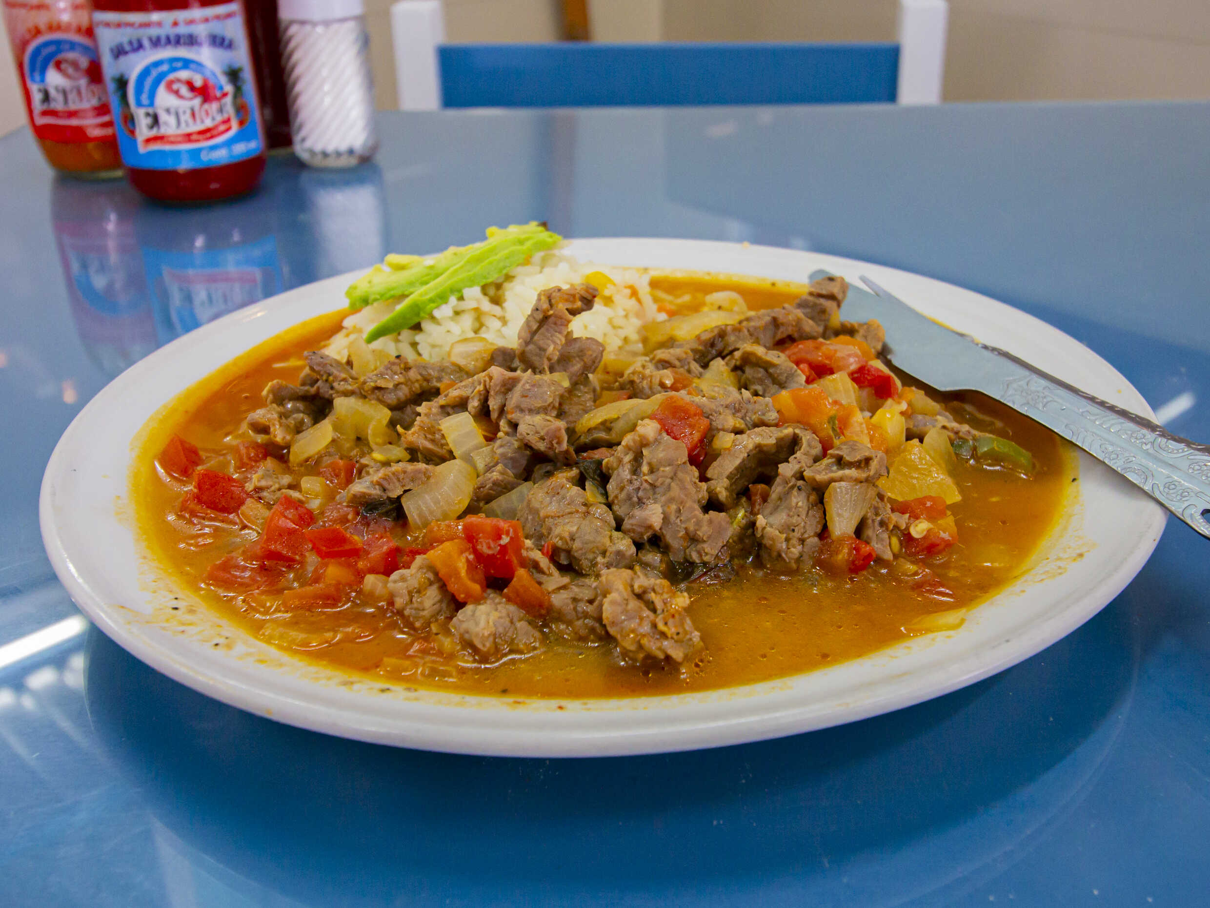 Filete de res guisado con jitomate, cebolla , chile, cilantro y consomé. Acompañado de arroz blanco y aguacate.