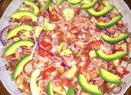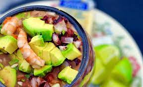 Coctel a base de camarón y pulpo preparado con jitomate, aguacate, cebolla, cilantro, jugo de limón, salsa inglesa, aceite de olivo y cátsup.