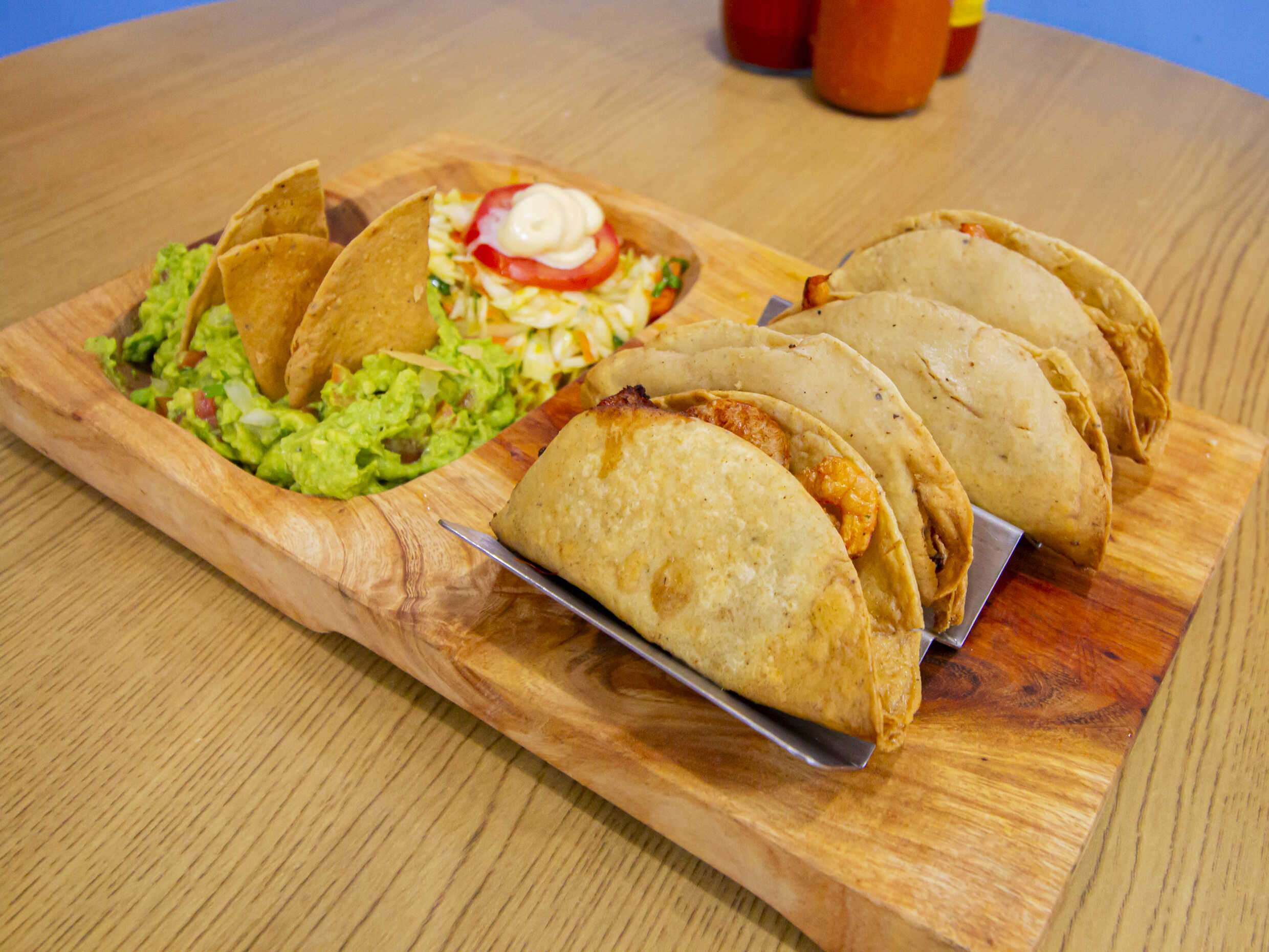 Orden con 5 tacos rellenos de camarón guisado a la mexicana, acompañados de guacamole y ensalada de repollo.