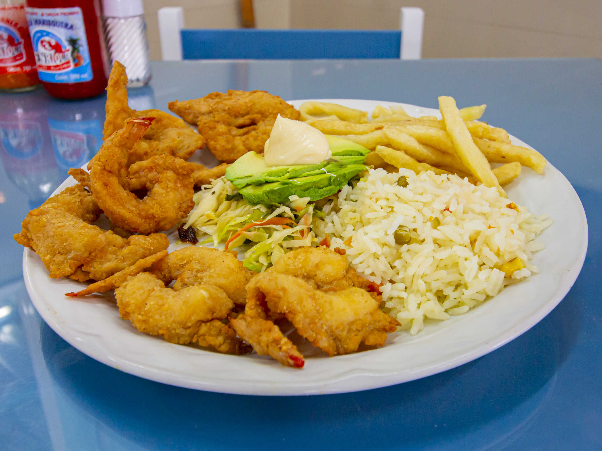 6 Pzas de camarón empanizado acompañados de ensalada de repollo, papas y arroz blanco.