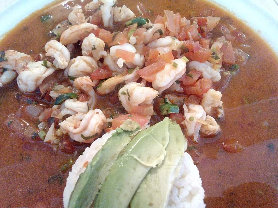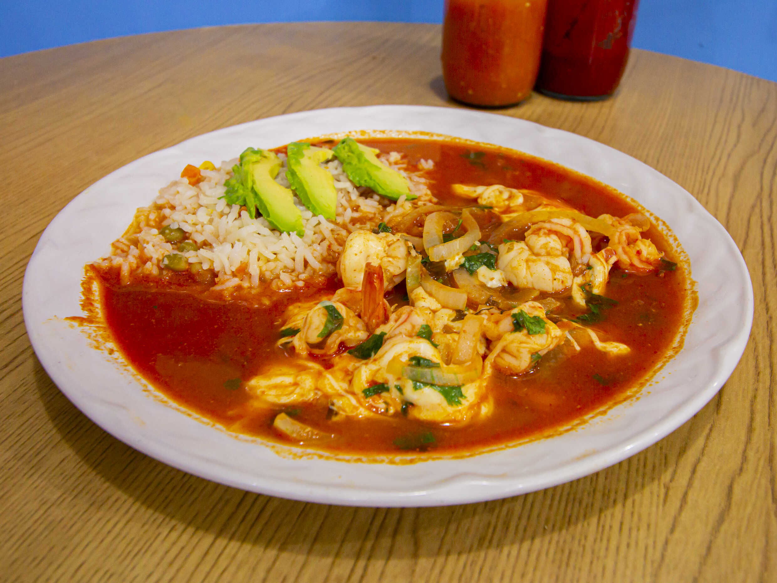 8 Pzas de camarón guisados con jitomate, cebolla, chile, cilantro y consomé. Acompañado de arroz blanco y aguacate.