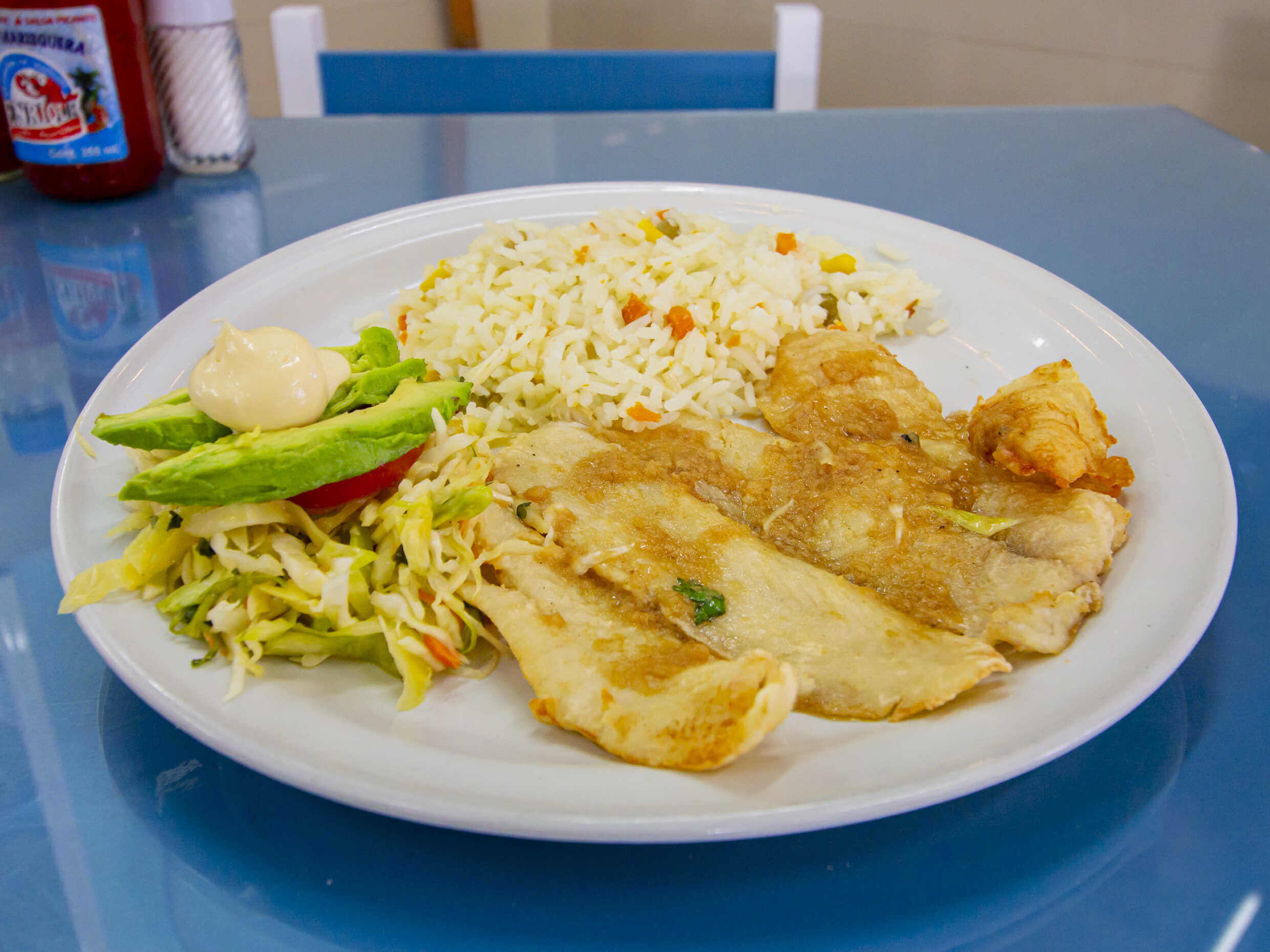 Filete de pescado frito en mantequilla con cebolla, salsa picante, queso asadero y cilantro. Acompañado de arroz blanco y aguacate.