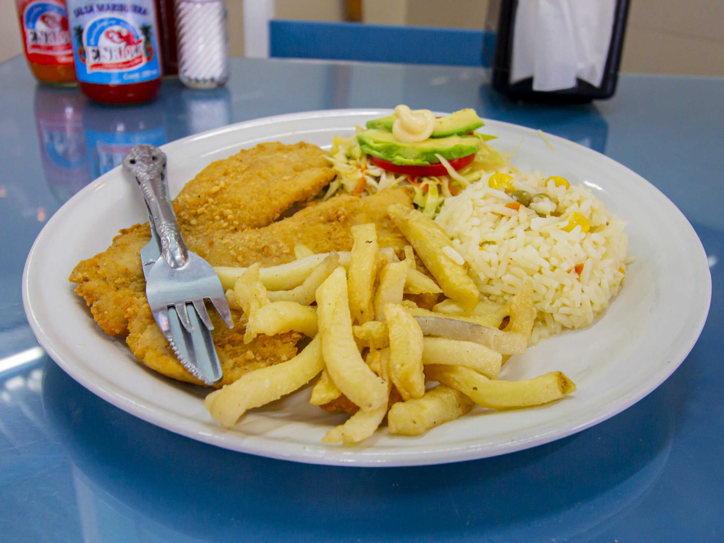 Filete de res empanizado, acompañado de ensalada de repollo, papas y arroz blanco.