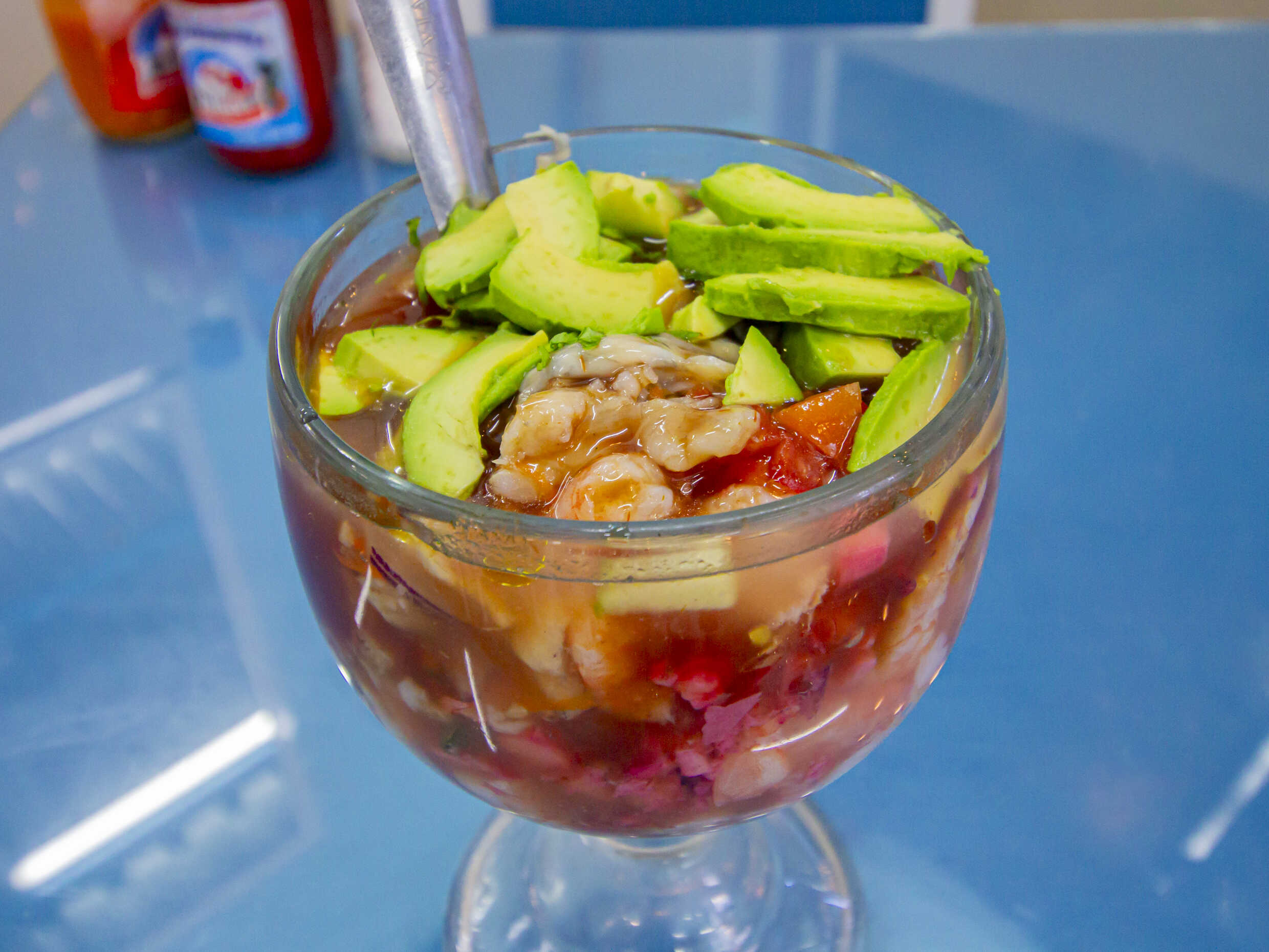 Coctel a base de camarón, pulpo y ostión preparado con jitomate, aguacate, cebolla, cilantro, jugo de limón, salsa inglesa, aceite de olivo y cátsup.