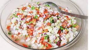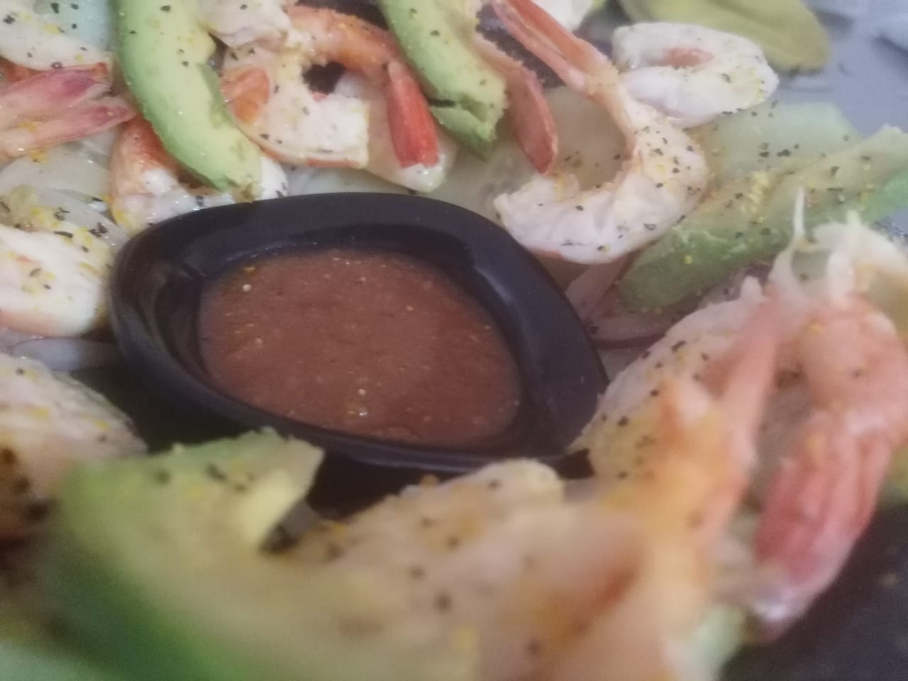 9 Pzas de camarón cocido en jugo de limón y especias, sobre una cama de pepino, cebolla morada, blanca y aguacate. Acompañado de salsa habanera.