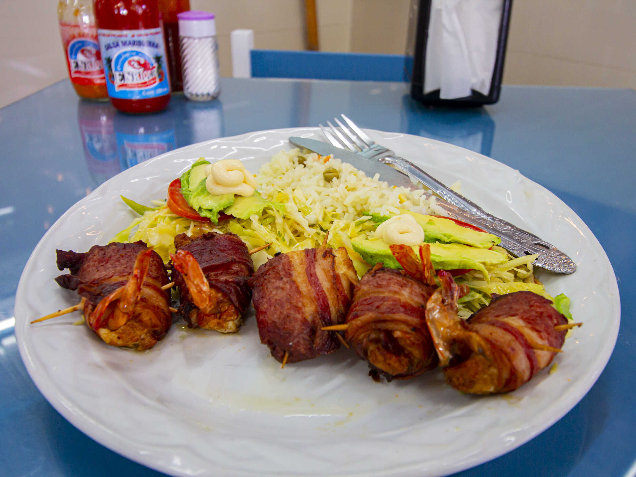 4 Pzas de camarón relleno de queso panela, envuelto en tocino. Acompañado de ensalada de repollo y arroz blanco.