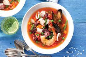 Caldo de mariscos con camarón, pulpo, ostión y pescado.