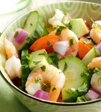 Camarón pacotilla con ensalada de legumbres y mayonesa, acompañado de pepino, jitomate y aguacate.