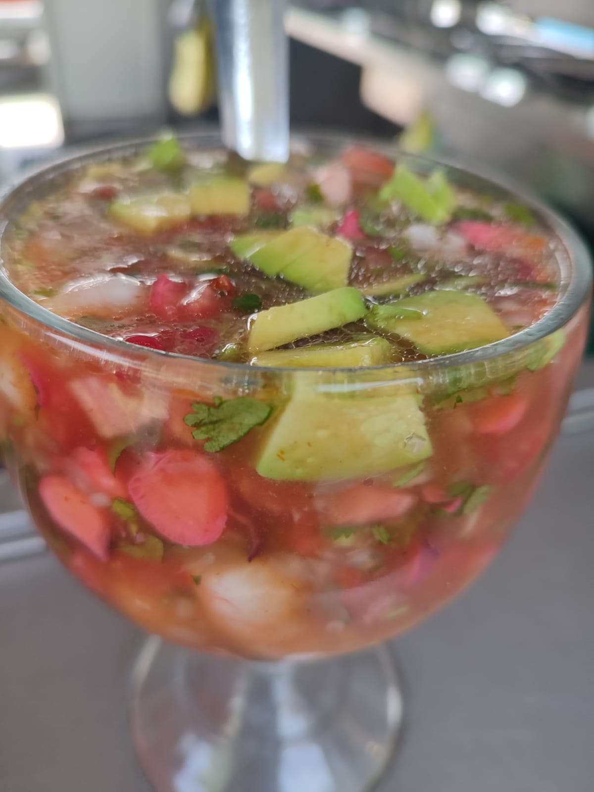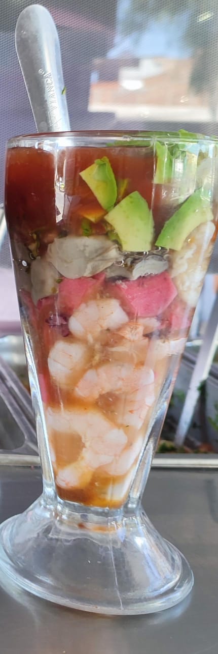 Coctel a base de camarón, pulpo y ostión preparado con jitomate, aguacate, cebolla, cilantro, jugo de limon, salsa inglesa, aceite de olivo y cátsup.