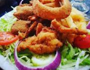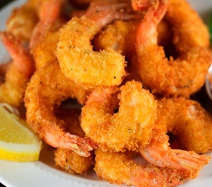 6 pzas de camarón empanizado acompañados de ensalada de repollo, papas y arroz blanco.