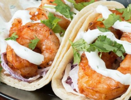 Órden con 5 tacos rellenos de camarón guisado a la mexicana, acompañados de guacamole y ensalada de repollo.