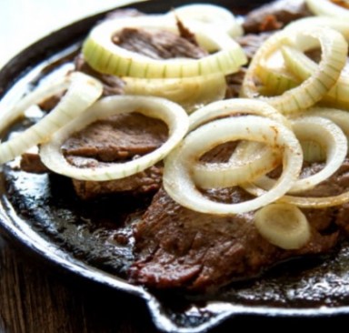 Filete de res frito con cebolla, acompañado de ensalada de repollo y arroz blanco.