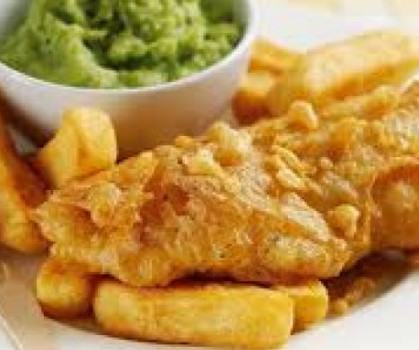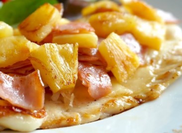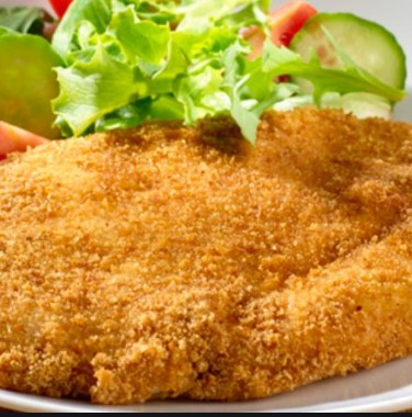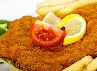 Filete de pescado empanizado con jamón, queso asadero, piña y cerezas. Acompañado de ensalada de repollo y papas.