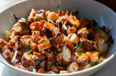 Coctel a base de camarón y pulpo preparado con jitomate, aguacate, cebolla,cilantro, jugo de limón, salsa inglesa, aceite de olivo y cátsup.