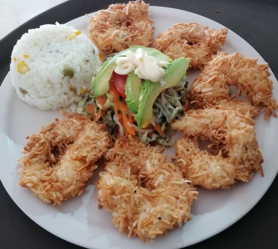 6 pzas de camarón empanizado con coco, acompañado de ensalada de repollo, papas y arroz blanco.