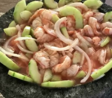 9 pzas de camarón cocido en jugo de limón y especias, sobre una cama de pepino, cebolla morada, blanca y aguacate. Acompañado de salsa habanera.