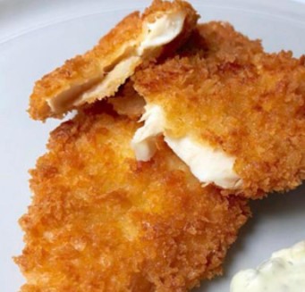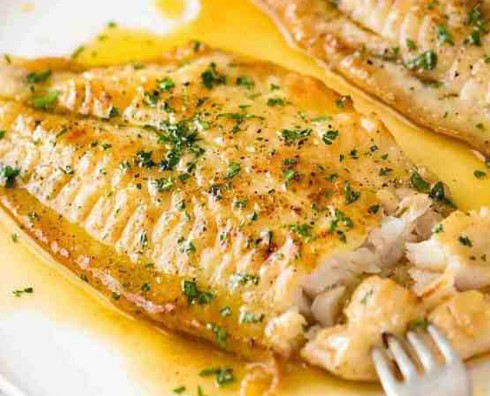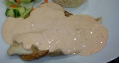 Filete de pescado frito en mantequilla con queso amarillo y crema. Acompañado de arroz, chile serrano y aguacate.