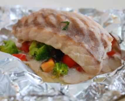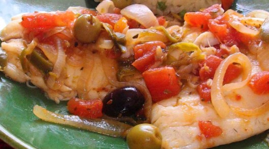 Filete de pescado con jitomate, chile, cebolla, cilantro y consome de pescado. Acompañado de arroz blanco y aguacate.