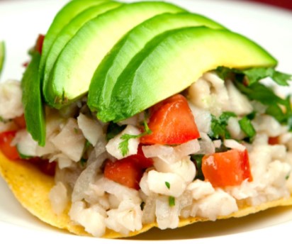 Tostada con ceviche de pescado preparado con jitomate, cilantro, mayonesa, acompañado con aguacate.