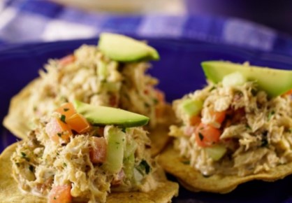 Tostada de jaiba guisada con jitomate, cebolla, chile serrano, pure y especias. Acompañado con aguacate y limón.