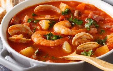 Caldo de mariscos con camarón, pulpo, ostión y pescado.