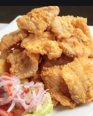 Filete de pescado frito en mantequilla con cebolla, salsa picante, queso asadero y cilantro. Acompañado de arroz blanco y aguacate.