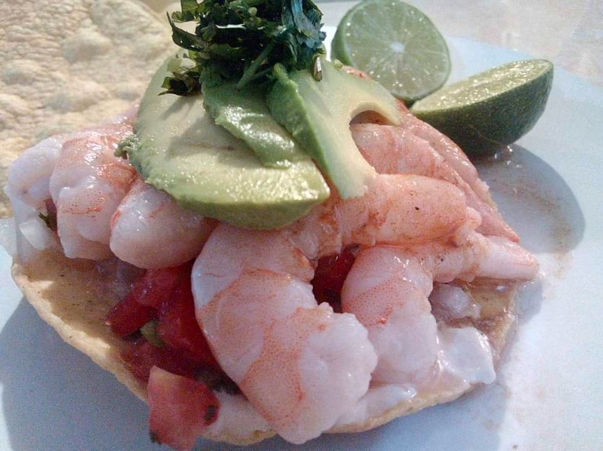 Tostada con camarón, mayonesa, jitomate, cebolla, cilantro, aguacate, aceite de olivo, jugo de limón y salsa inglesa.