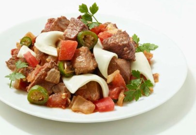 Filete de res guisado con jitomate, cebolla , chile, cilantro y consomé. Acompañado de arroz blanco y aguacate.