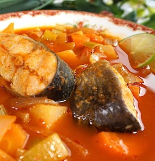 Caldo de pescado con 2 postas de bagre, zanahoria y apio.