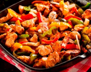 Tiras de pollo frito con pimiento, cebolla y especias, acompañado de aguacate y bbq.