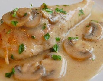 Filete de pollo frito en mantequilla con queso amarillo, crema y champiñones. Acompañado de arroz blanco y aguacate.