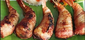 4 pzas de camarón relleno de queso panela, envuelto en tocino. Acompañado de ensalada de repollo y arroz blanco.
