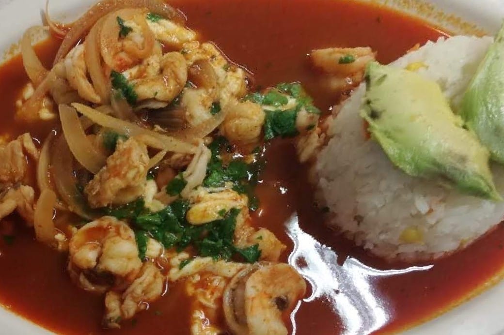 8 pzas de camarón guisados con jitomate, cebolla, chile, cilantro y consome. Acompañado de arroz blanco y aguacate.