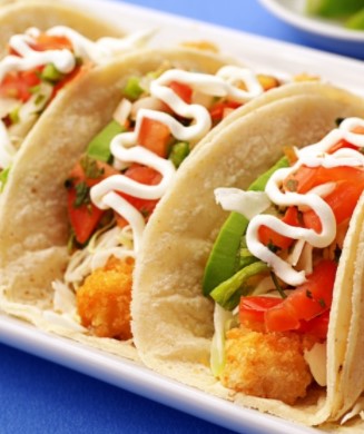 Órden con 5 tacos rellenos de pescado guisado a la mexicana, acompañados de guacamole y ensalada de repollo.