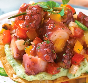 Tostada con pulpo, mayonesa, jitomate, cebolla, cilantro, aguacate aceite de olivo, jugo de limón y salsa inglesa.