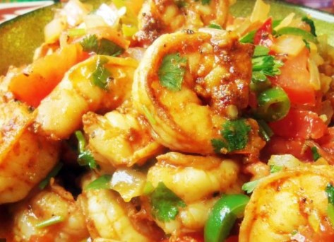 8 pzas de camarón frito en mantequilla con cebolla, salsa picante, queso asadero y cilantro. Acompañado de arroz blanco y aguacate.