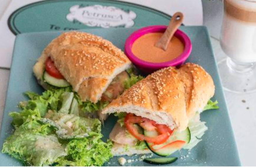 Pan baguette con jamón de pechuga de pavo, aderezo de chipotle, queso philadelphia, queso manchego, lechuga, jitomate y pepino.