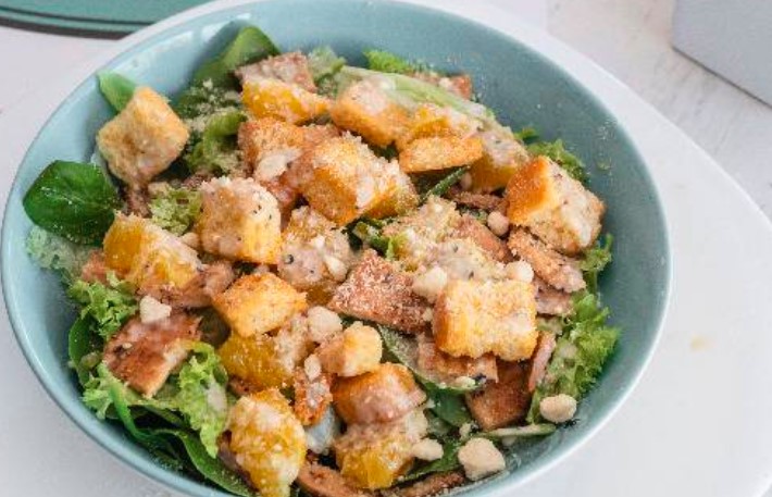 Lechugas mixtas, gajos de toronja y naranja, pechuga de pollo a la plancha acompañada de crutones y aderezo césar.