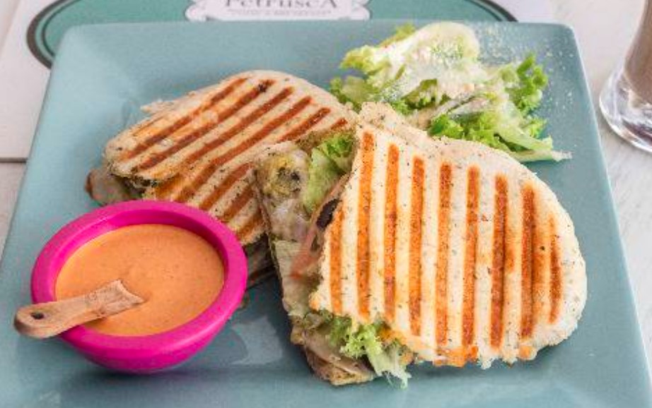 Panini relleno de queso philadelphia, champiñones, queso mozarella, peperoni y aderezo de chipotle.
