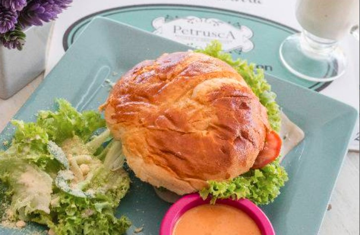 Panini relleno de calabaza, pimiento, jitomate y queso panela asado con lechuga y aderezado con aceite de oliva y hierbas finas.