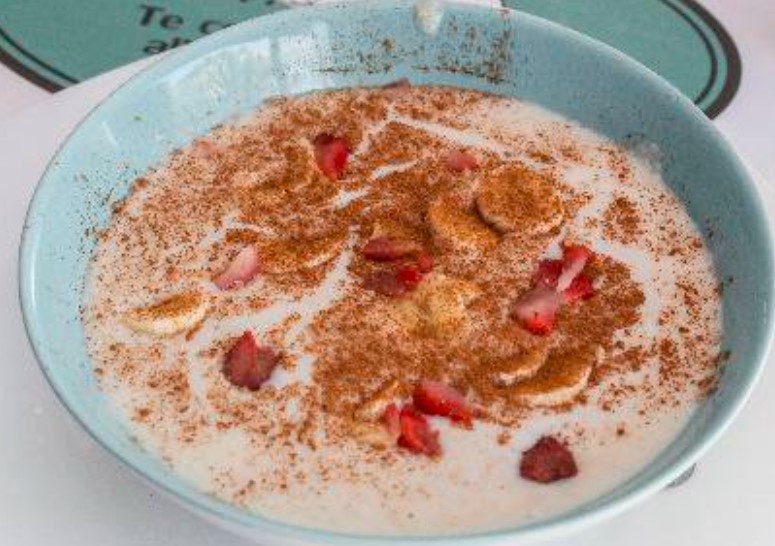Crepa rellena de queso philadelphia, con fresa, kiwi y durazno rebanado arriba y bañada de lechera.