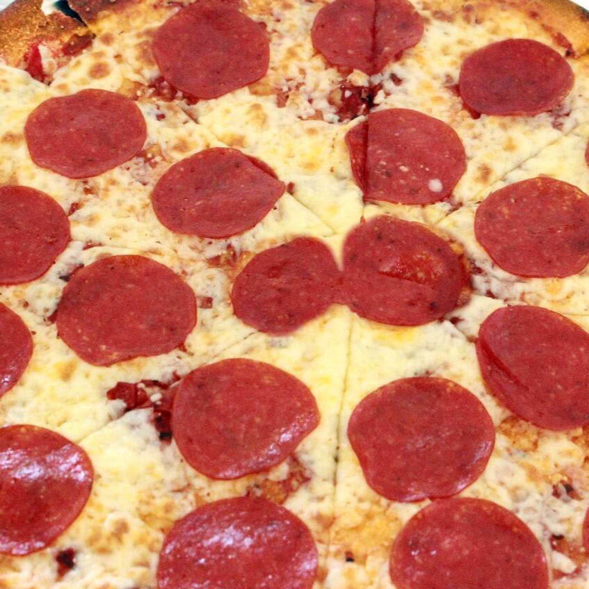 Preparada con pepperoni y queso de alta calidad. Pizza artesanal, de masa delgadita, grande, horneada al ladrillo refractario.