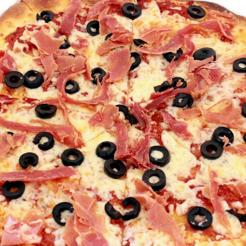 Preparada con jamón serrano y aceitunas. Pizza artesanal, de masa delgadita, mediana, horneada en base de ladrillo refractario con ingredientes de alta calidad.