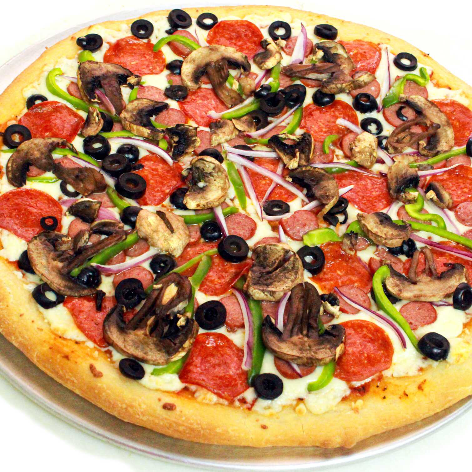 Preparada con pepperoni, salchicha 100% de res, champiñón, pimiento, aceituna y cebolla. Pizza artesanal, de masa delgadita, grande, horneada al ladrillo refractario.